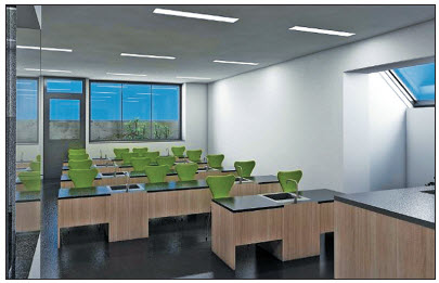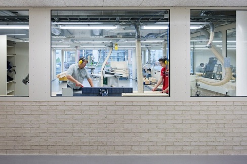 Взаимодействию с окружающей средой помогают широкие окна, выходящие на улицу. Галереи для учащихся расположены вдоль окон, выходящих в школьный двор. Так дети не чувствуют себя запертыми в четырех стенах.
