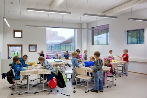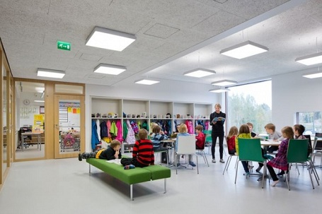 На 10500 квадратных метров находятся начальная и средняя школы, дошкольное отделение, дом молодежи, театральный зал, столовая, библиотека, спортивный зал и многое другое. Обучение проходит в расслабленной атмосфере. Каждый ребенок сидит как хочет и где хочет, а общение между учениками во время урока поощряется.