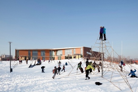 Открытые пространства тесно связаны с площадками внутреннего двора, выделенными для каждой возрастной группы, но являющиеся частью единого целого. Создатели проекта считают, что если поставить забор, то любому ребенку захочется бунтовать, поэтому в школе двор открытый. И, конечно, нет никаких охранников и рамок металлоискателей. Да, есть видеокамеры, но меры безопасности незаметны.