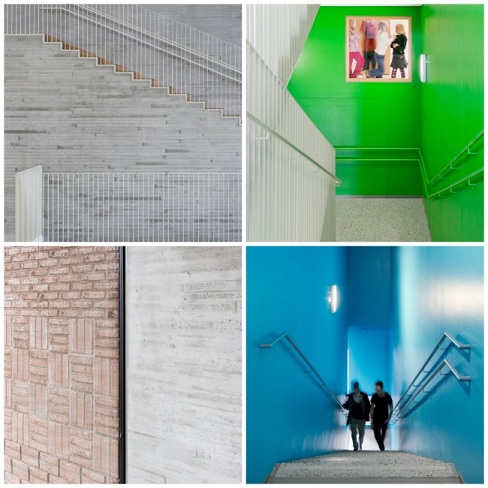 Для отделки интерьеров и фасадов здания архитекторы использовали экологичные природные материалы, которые создают комфортную теплую атмосферу. Наружная кирпичная кладка школы с обучающей целью положена разными способами, местами беспорядочно, чтобы детям хотелось пощупать кирпичи. А там, где можно порезвиться и отвлечься (в вестибюле, на лестничных площадках), стены раскрашены в яркие цвета. У каждого класса свой холл особого цвета, заблудиться невозможно.
