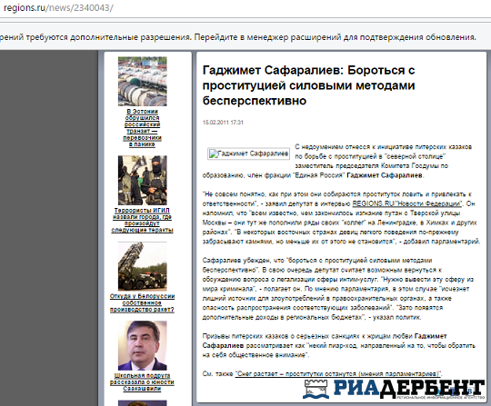 Правда, образ жизни самого депутата сложно принять за образец высокой морали. Но дело даже не в этом, а в том, что Сафаралиев противоречит самому себе. В свое время он предлагал легализовать проституцию и наполнять региональные ( подчеркнуто нами!) бюджеты. Так чего же на самом деле Сафаралиев желает родному Дагестану!? И как вообще понимать ханжество политика, который, с одной стороны, предлагает легализовать проституцию, а с другой — публично третирует девочку, предлагая ей забыть что она из Дагестана?!