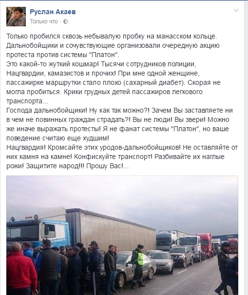 В четверг, 6 апреля, экс-советник министра печати и информации Дагестана Руслан Акаев призвал бойцов Национальной гвардии применить силу против дальнобойщиков, несогласных с введением системы «Платон».