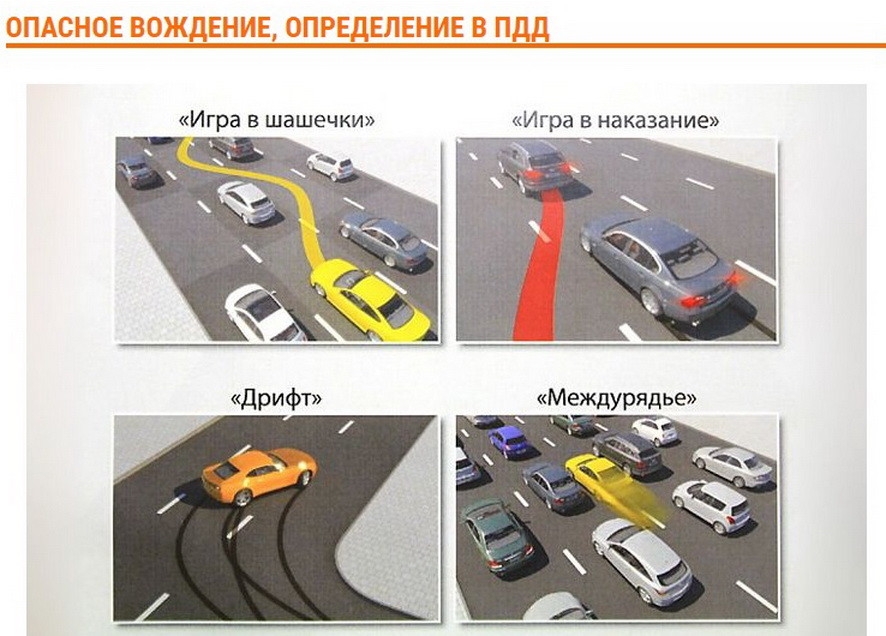 невыполнение при перестроении требования уступить дорогу транспортному средству, пользующемуся преимущественным правом движения; перестроение при интенсивном движении, когда все полосы движения заняты, кроме случаев поворота налево или направо, разворота, остановки или объезда препятствия; несоблюдение безопасной дистанции до движущегося впереди транспортного средства; несоблюдение бокового интервала; резкое торможение, если такое торможение не требуется для предотвращения дорожно-транспортного происшествия; препятствование обгону.