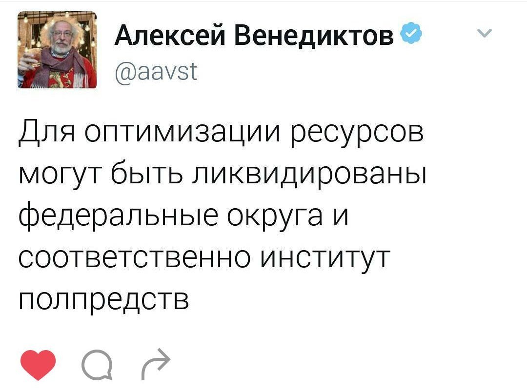 С целью экономии средств правительство РФ может ликвидировать федеральные округа, а с ними и институт полпредств. Об этом в Twitter написал главный редактор «Эхо Москвы» Алексей Венедиктов.