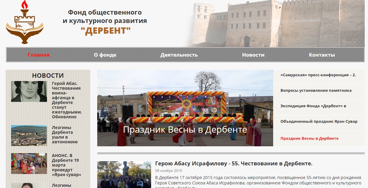 Учредитель РИА «Дербент» Фонд общественного и культурного развития «Дербент» обзавелся собственным сайтом. Теперь всю информацию о Фонде «Дербент» и его деятельности можно узнать, зайдя на его страницу в Интернете. Там же будут выставляться новости и анонсы всех мероприятий, организованных Фондом «Дербент».