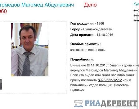 Отдел полиции по Советскому району Махачкалы сообщает, что после проведения ОРМ в рамках уголовного дела, возбужденного по ст. 126 ч. 1 УК РФ — «Похищение человека», в Махачкале была задержана гражданка Магомедова П.М. По данным следствия, Магомедова совершила убийство своего отца Магомедова Магомеда Абдуллаевича, который с 21. 10. 2016 года, по сводкам МВД Дагестана, значился как без вести пропавший.