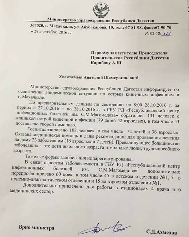 «По предварительным данным, с 27 по 28 октября в ГБУ РД «Республиканский центр инфекционных болезней» обратился 131 человек с подозрением на острую кишечную инфекцию (79 детей, 52 взрослых), в том числе 53 человека были доставлены скорой помощью», — сообщают в министерстве здравоохранения Дагестана.