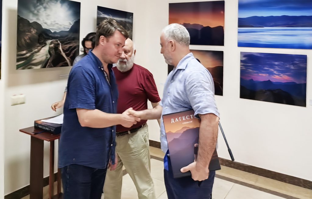Фото Амиля Саркарова: Иван Козорезов вручает свой фотоальбом заместителю председателя Попечительского совета ДРО РГО Муслиму Гиндиеву на выставке «Земля Расула», организованной под эгидой РГО в Театре поэзии (2023 г.).
